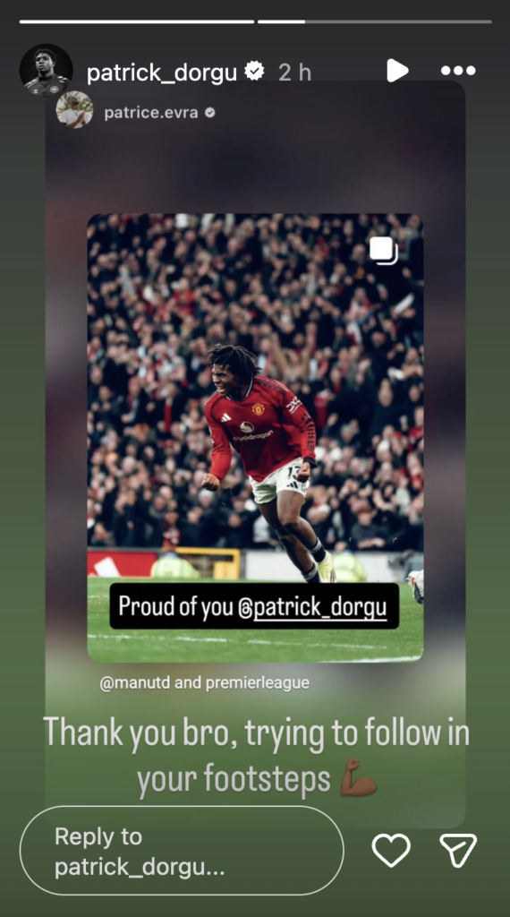 Patrice Evra was very pleased with the youngster’s display against City and posted an Instagram story of Dorgu, with the caption, “Proud of you”.