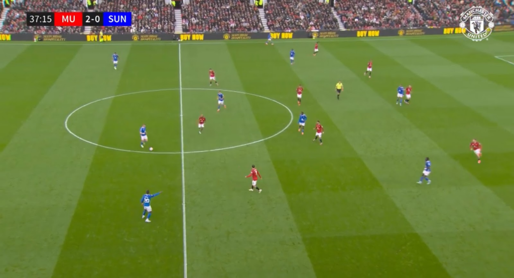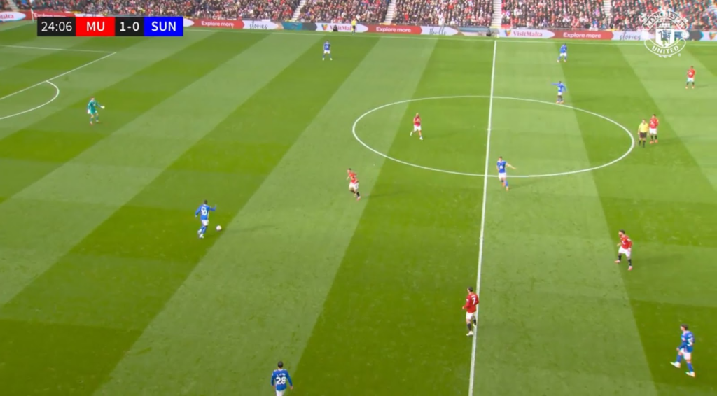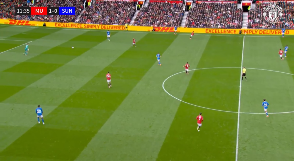 When the ball was played to the centre-backs, though, United would trigger the press. Šeško and Mbeumo would press the centre-backs. This meant Xhaka became free, so Fernandes was responsible for tracking him. Casemiro continued to mark Sadiki, while Le Fee became free. Sunderland, therefore, had a +1 in midfield.